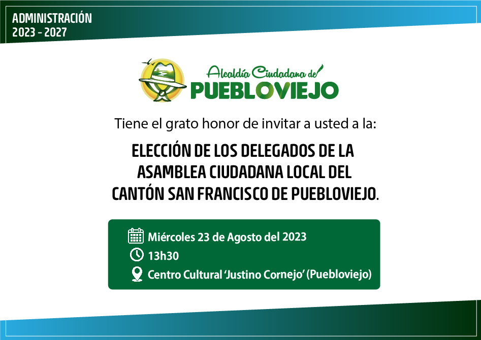 Invitación a la elección de los Delegados de la Asamblea Local Ciudadana del cantón San Francisco de Puebloviejo, este miércoles 23 de agosto del 2023 a las 13:30 en el Centro Cultural Prof. Justino Cornejo.